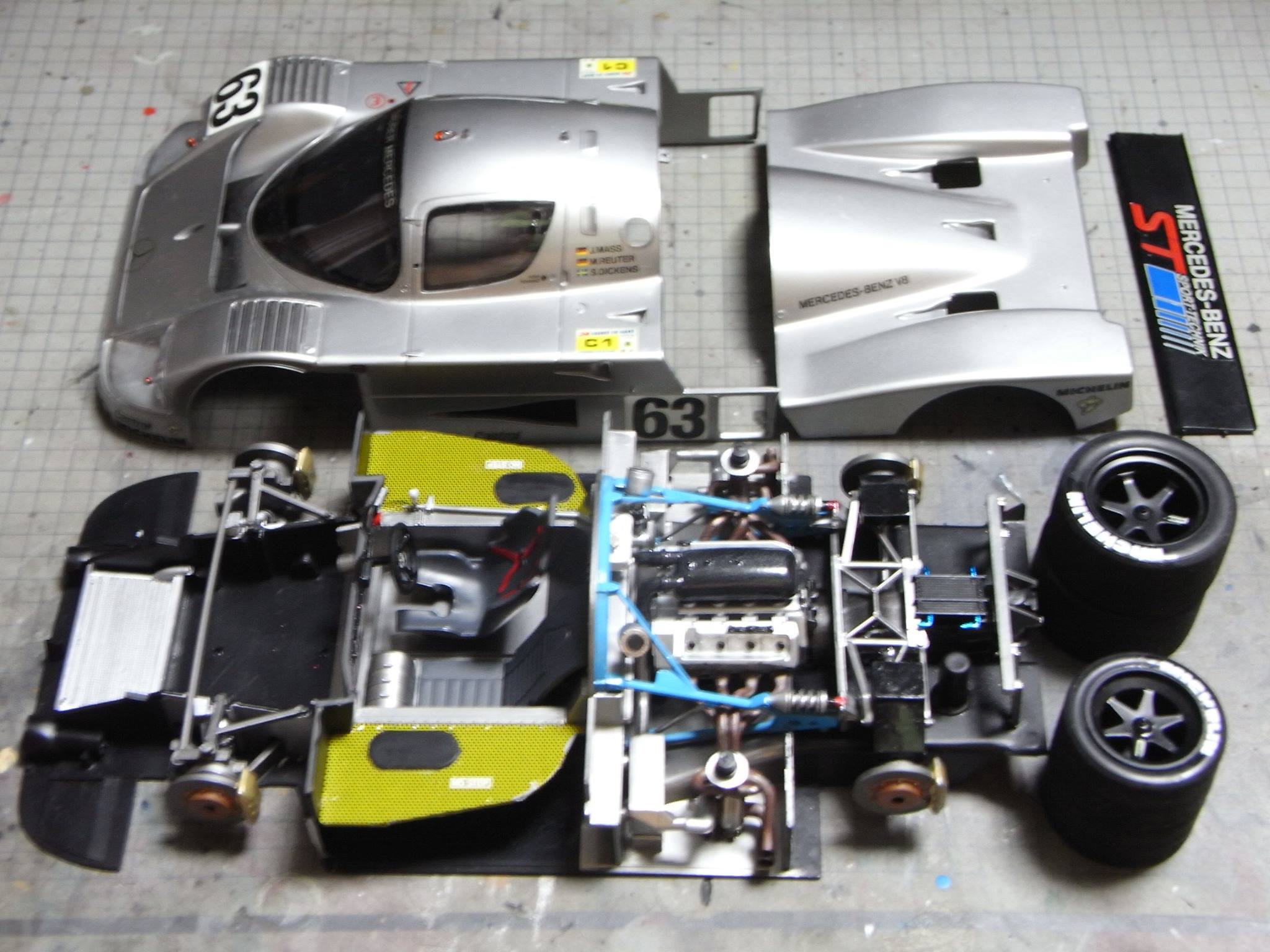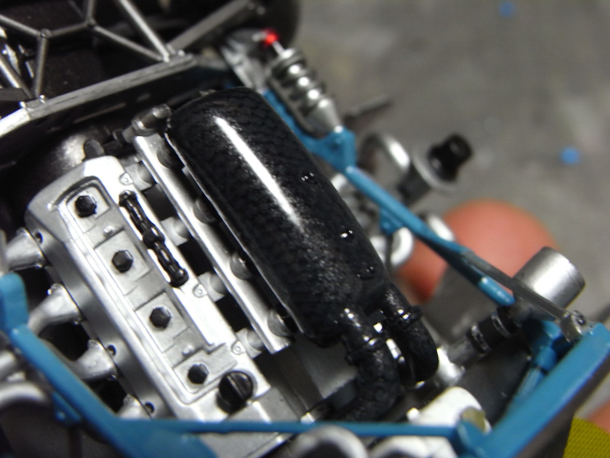 サイドミラーには、手持ちのミラーシートを貼っている。フロントフェンダー上のカバーも、キットの指定通りにアルミ箔パーツを装着。箱絵を参考にパイピングを始めたが、点火プラグコードでめげた。シャーシ裏面のケブラーの塗装をしたが、同時に工作をしていたマクラーレンの色を流用したので、ケブラーっぽくないのは見なかったことに。