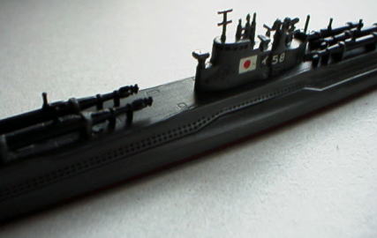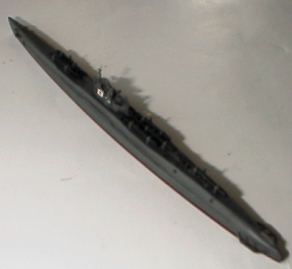 初めての、ウォーター・ライン潜水艦の完成品である。2001年10月21日に完成。わずか半日の工作である。 エッチング・パーツなどを使用すれば、もっと時間がかかると思うが、キットが非常に高品質なので、その必要はあまり感じられない。 ウォーター・ラインの画像を見るたびに、35万画素の限界を感じる。マクロはいいけど、全体の画像用としてはつらい。