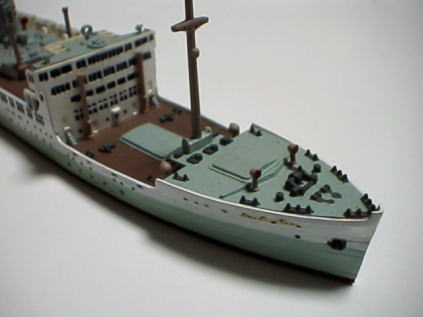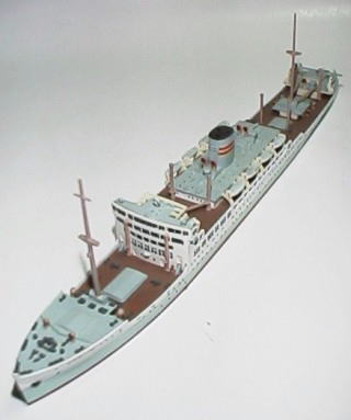 横浜生まれで、横浜育ち、ハマッ子の私が氷川丸を作れば、当然現在の黒い船体ではなく、脳裏に焼き付いている、ぺール・グリーン塗装の作品となる。 本物の氷川丸は、けっこう年期が入っているが、この氷川丸(思えば私の最初のウォーター・ラインの完成品)はウェザリングは施していない。 それでいいのだ!