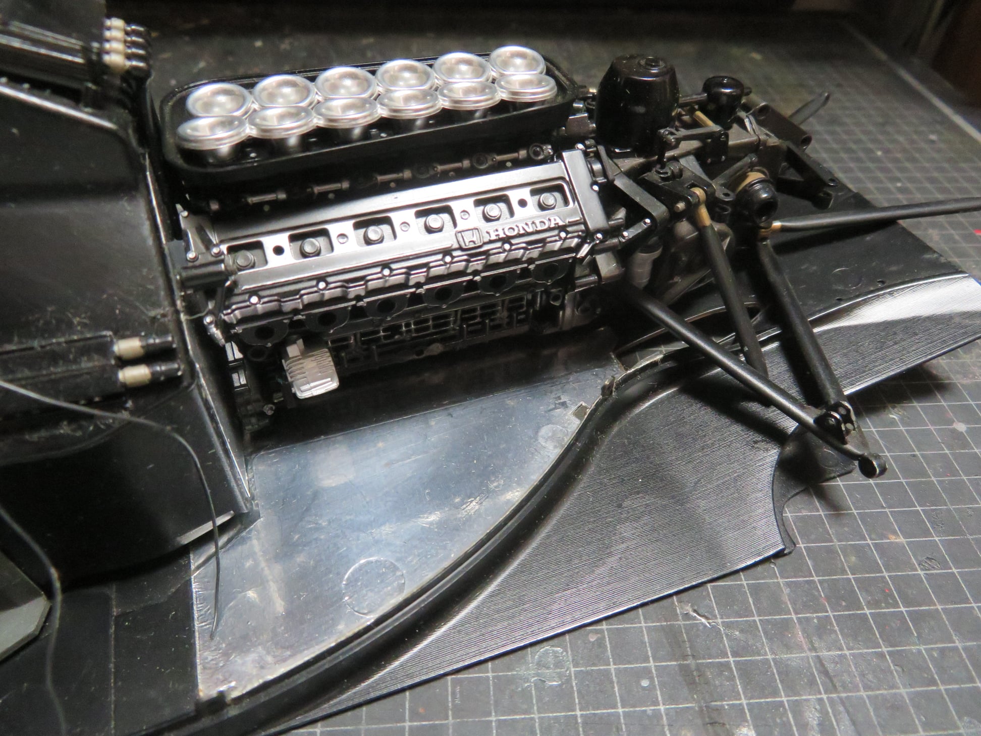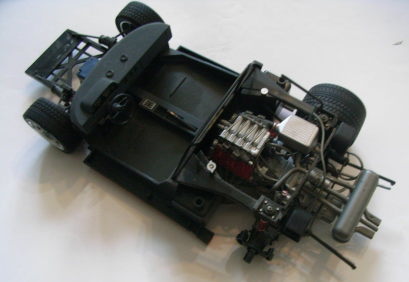 タミヤ 1/20 ロータス・ホンダ99T。このキットは上の2つのキットに比べると、故人の組み立て進み具合は遅かった。下の画像にあるように、ギアボックスの塗装は済んでいた。