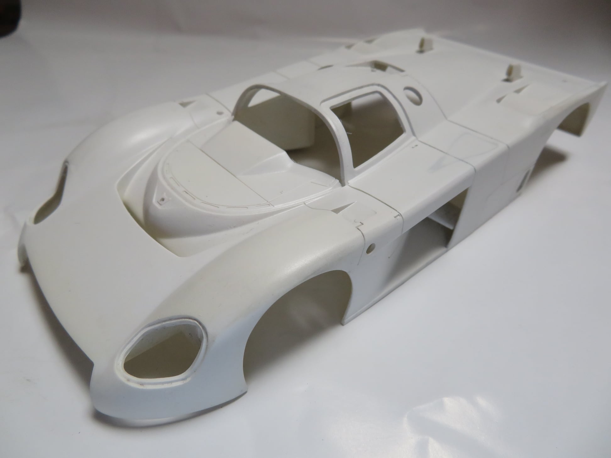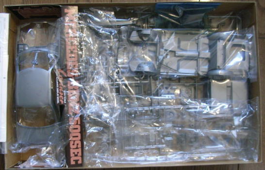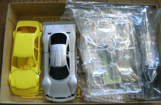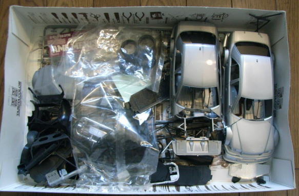 このキットを譲り受けた時に撮影した画像が以下。見た通りボディ(ボンネットとトランクリッド除く)が2つ入っていた。一つは白で塗装済みで、もう一つは無塗装。