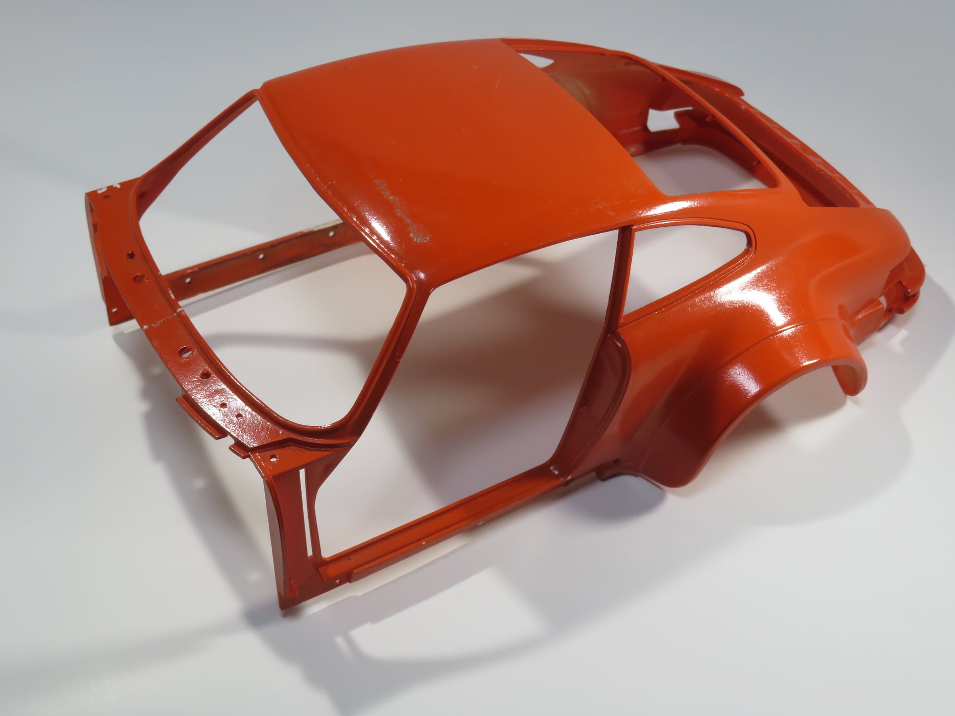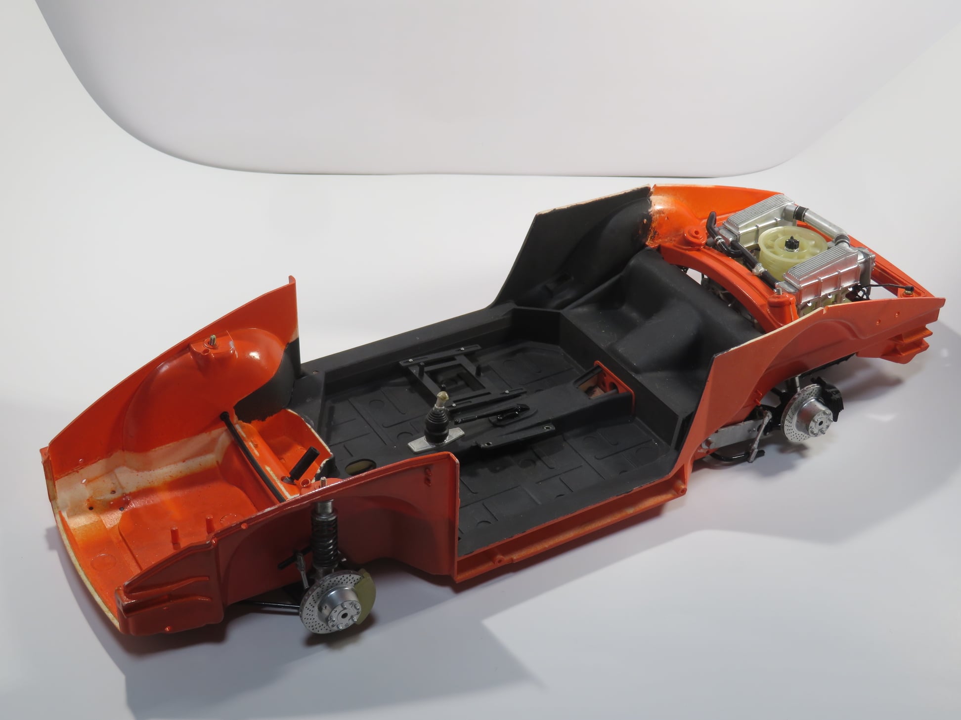 このキットはインテリアはほとんど完成しており、車体の白も塗装済みだった。 ただ蛍光赤を塗装をした形跡があり後日剥がされたと思われる。