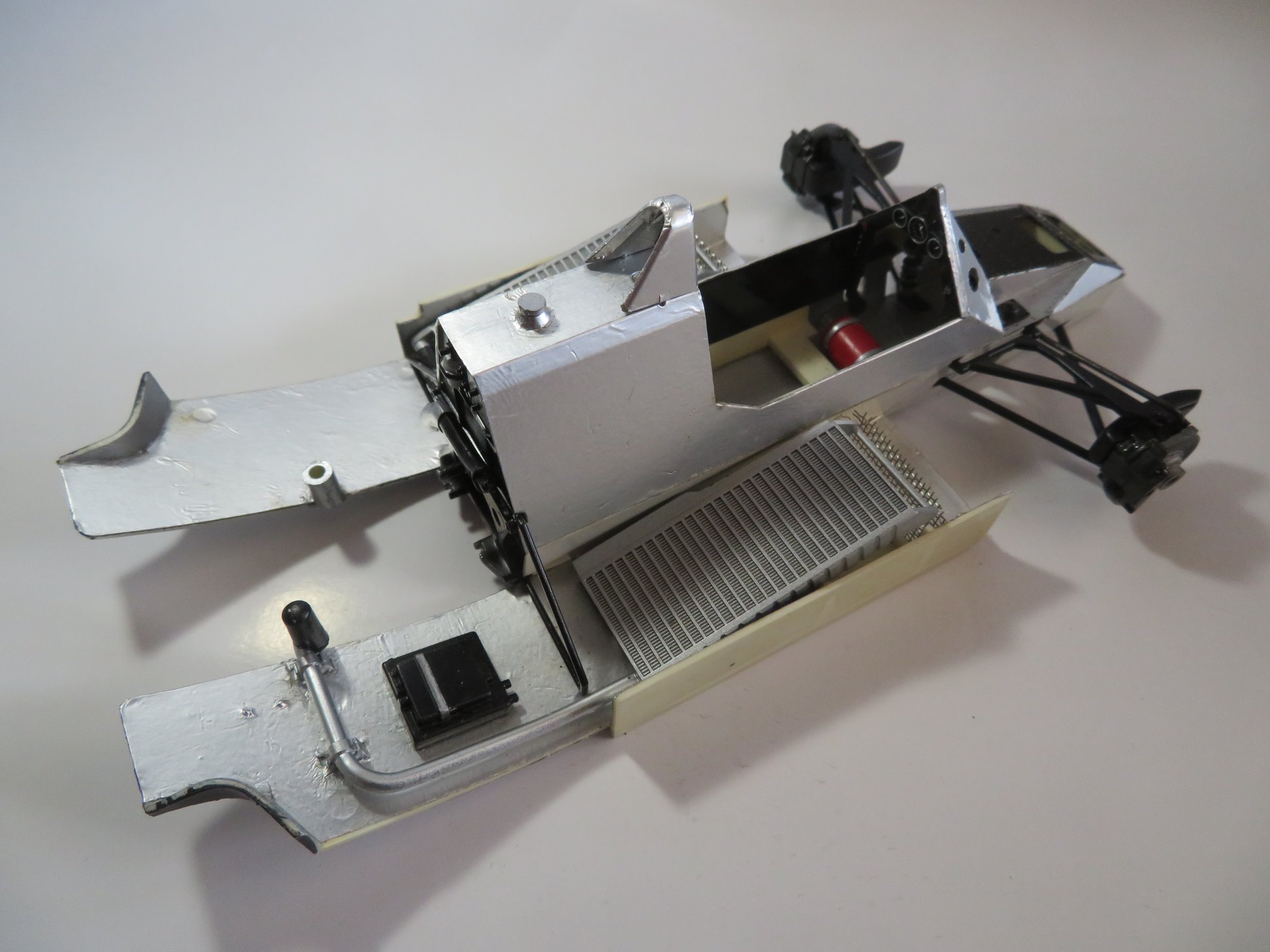 ここまで完成していたが、リアウイングのステーパーツが見当たらない。故人もそれが理由で製作をストップしたと思う。 パーツを手当てして完成としたいが、どうなる事やら。