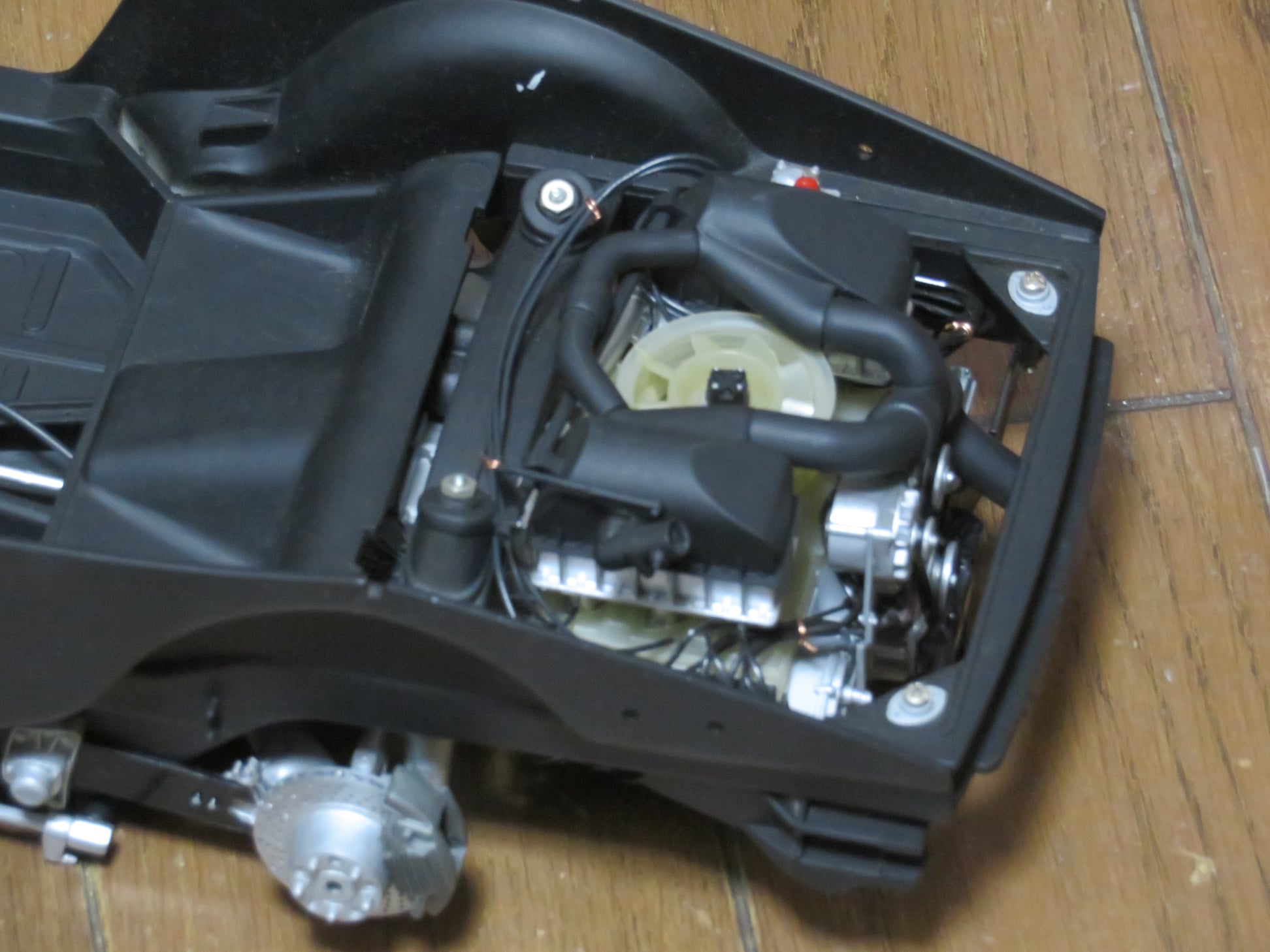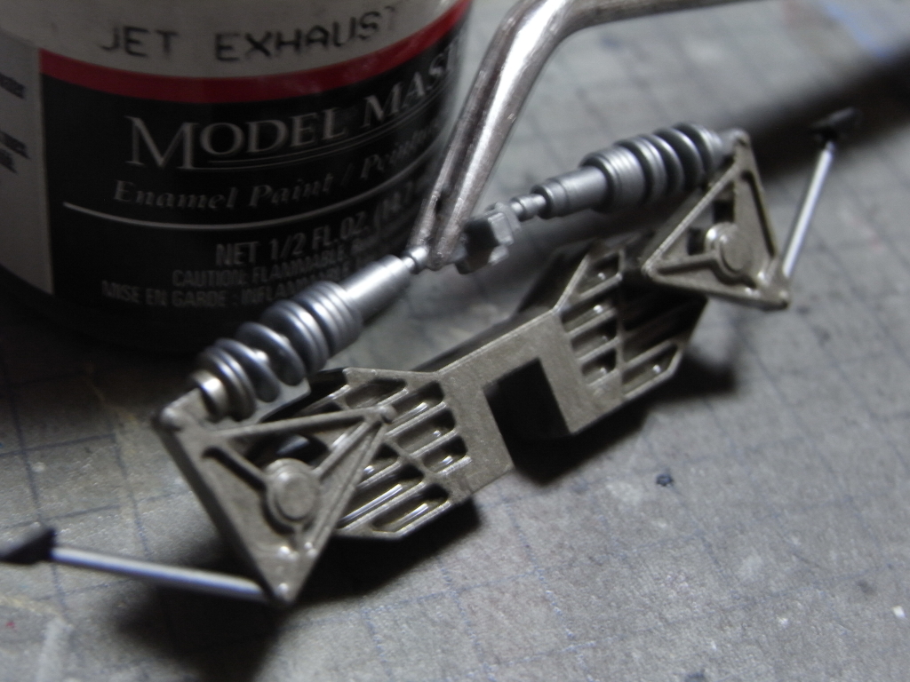 シャシー関係は不足しているパーツも無く、取れてしまったパーツのピンを真鍮線で復元したり、組み立て説明書に従って塗装、組み立てをした。後部のパネルはストッキングを使って、カーボンを塗装で表現。