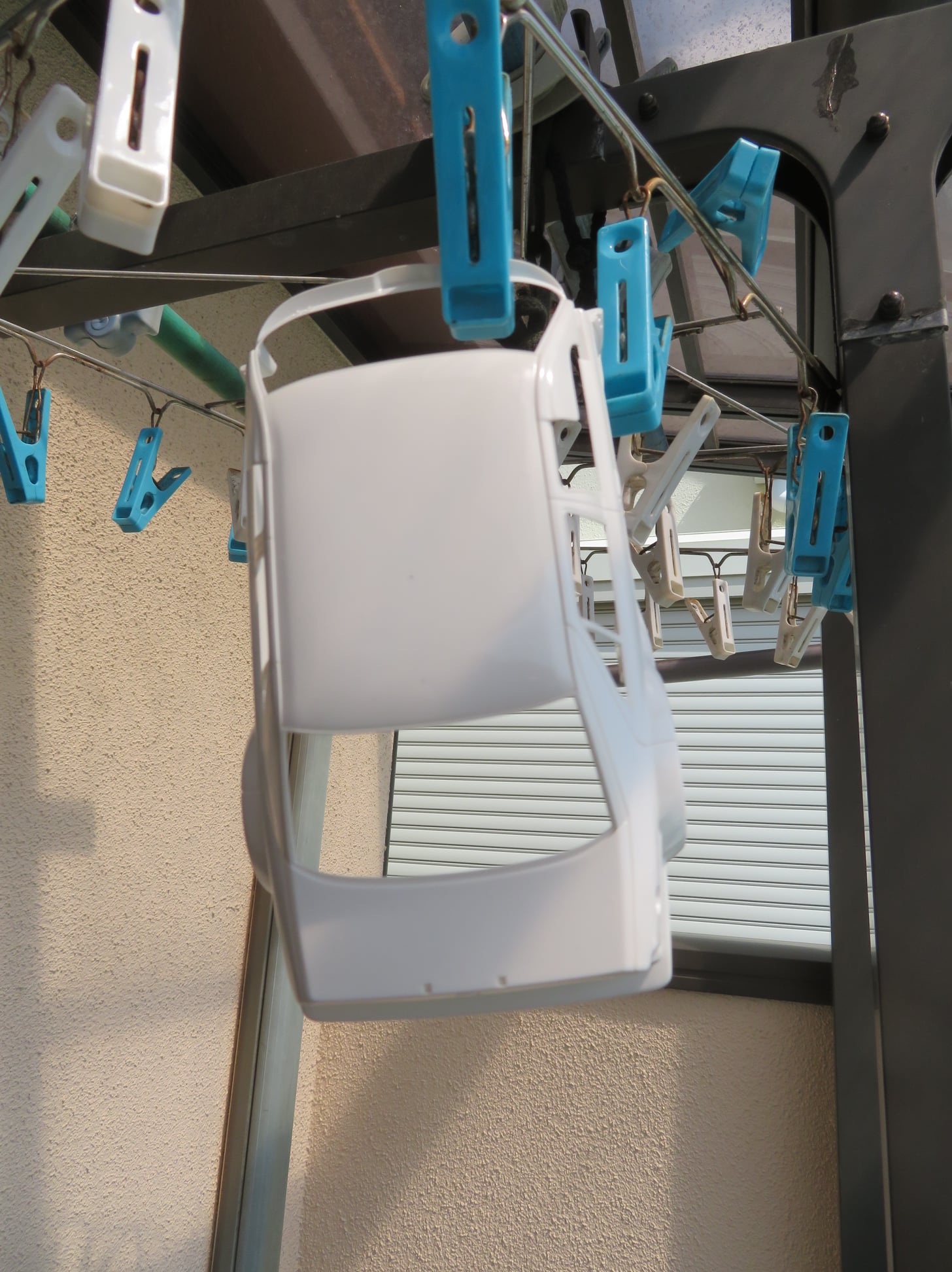 車体の塗装後、洗濯物干しの洗濯ばさみを活用して、乾燥させた。 その後数日間放置後にデカール貼り。 ペーパーやすりとコンパウンドで、デカールに気泡が入らない様にピカピカに磨く。