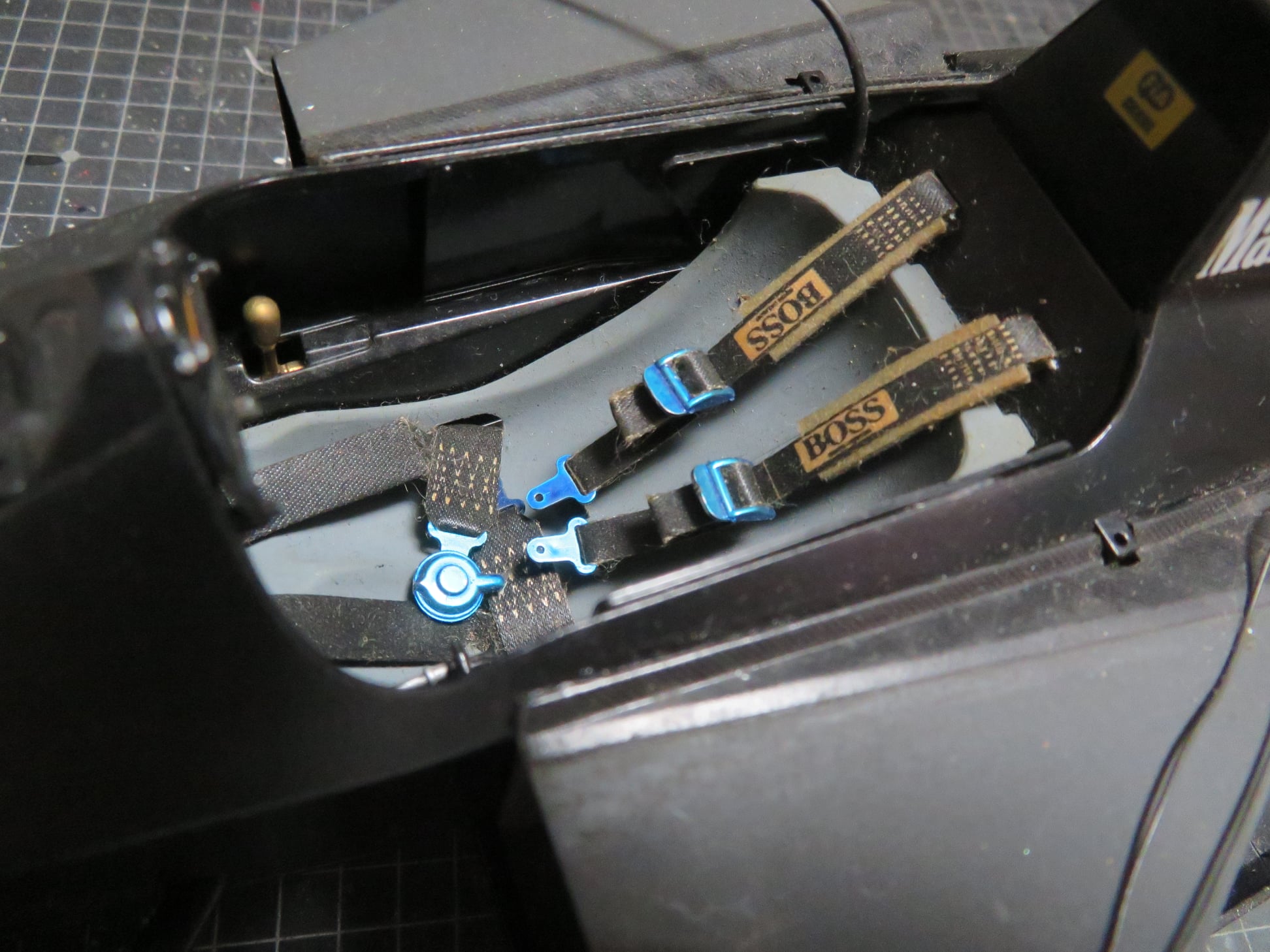 シートベルトは、デカールを紙にコピーして、切り抜いて貼り付けて表現した。プリンターの普及でコピーやデカール作成など、自宅で簡単に出来る様になって助かる。