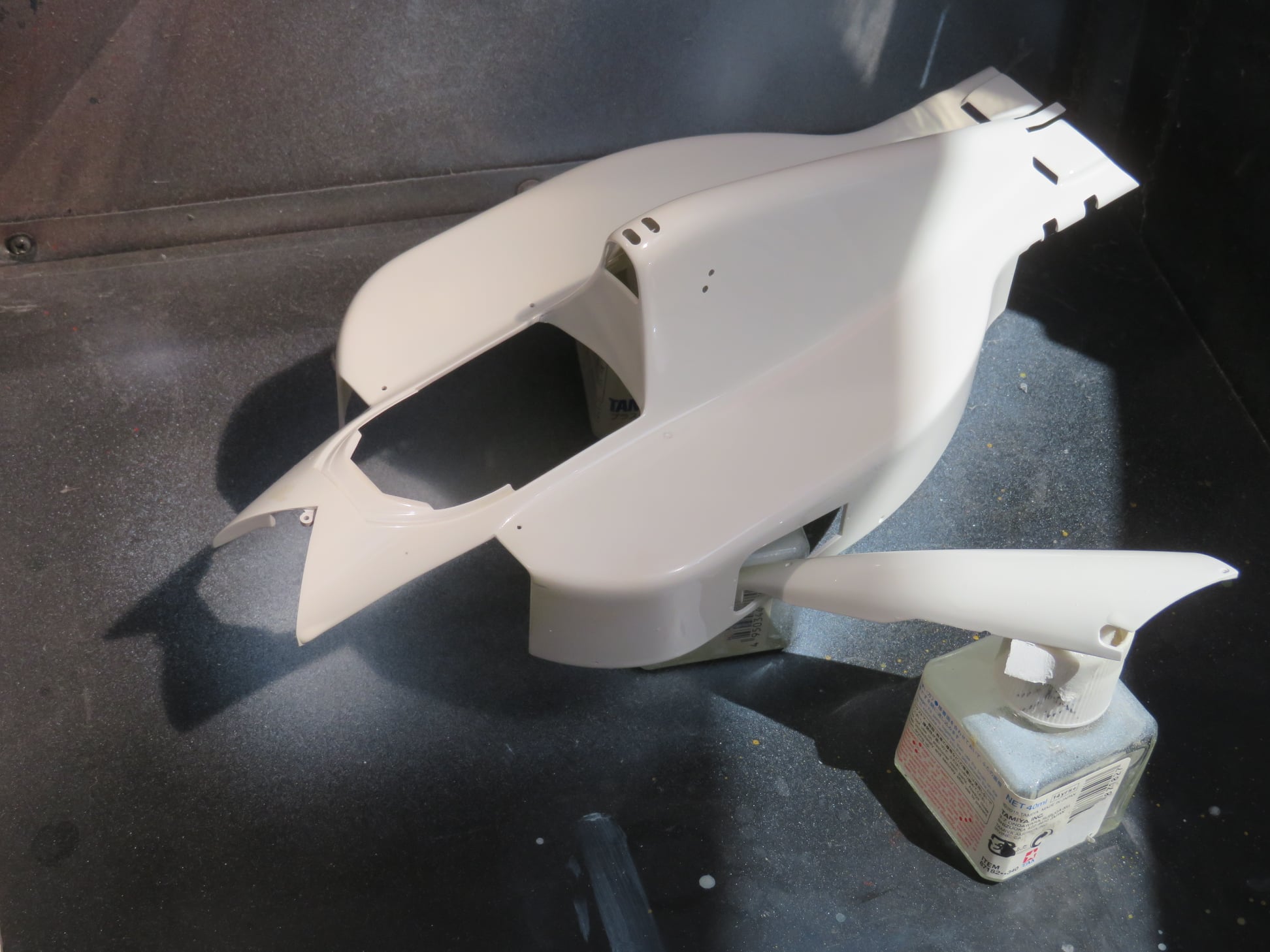 その後、前輪部分やクリアーパーツもデカールも見つかったが、バックミラーの片方が見あたらない。片方は割り箸の先端に両面テープで留めて白塗装をした状態で