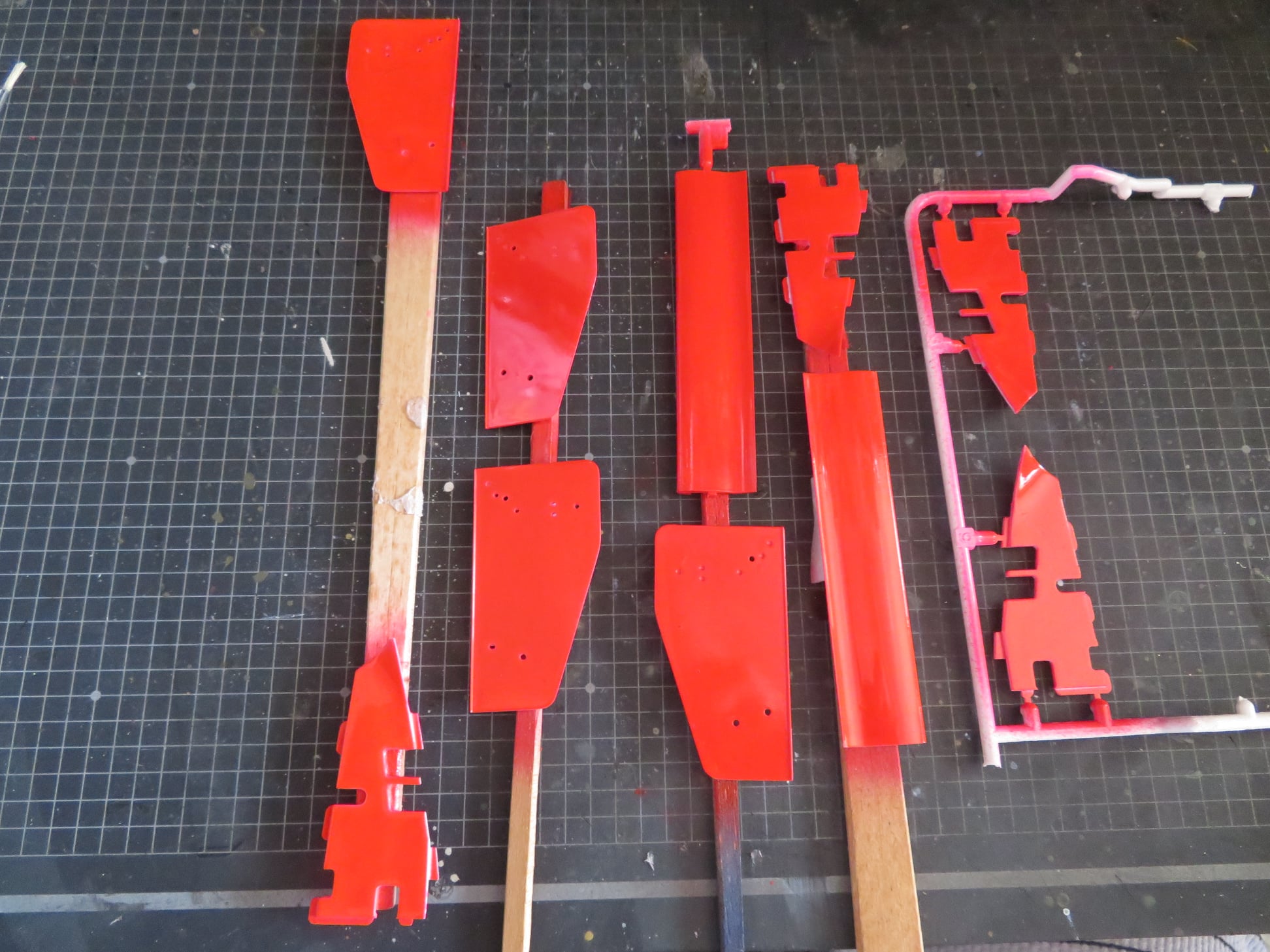 デカールの赤がとても微妙な色合いであり、私も調合して下の画像の様にマスキングテープとポリ袋でボディを覆って塗装をしたのだが...。