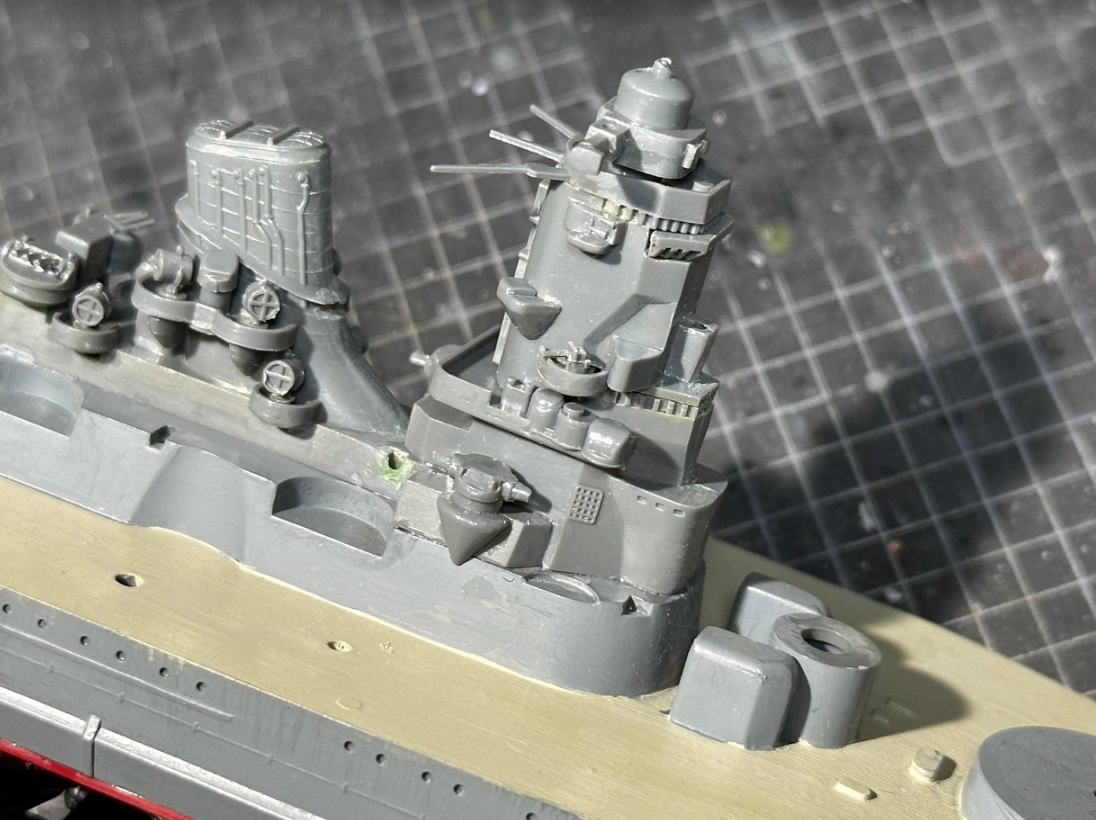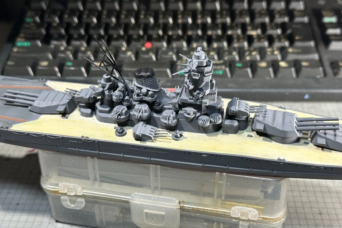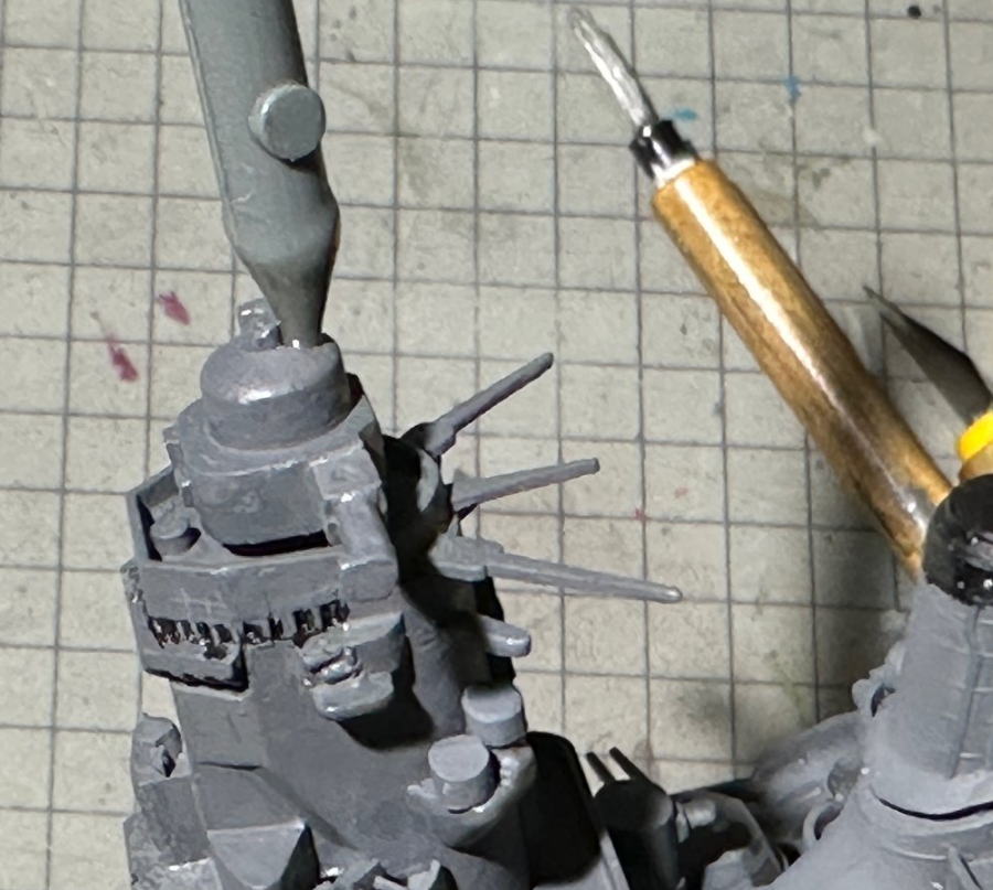 船体関係の塗装が完了すると残りのパーツを接着していくわけだが、劣化していたのかアンテナ支柱のパーティングラインを整形中に折れた。ここはまた大和のパーツを流用。