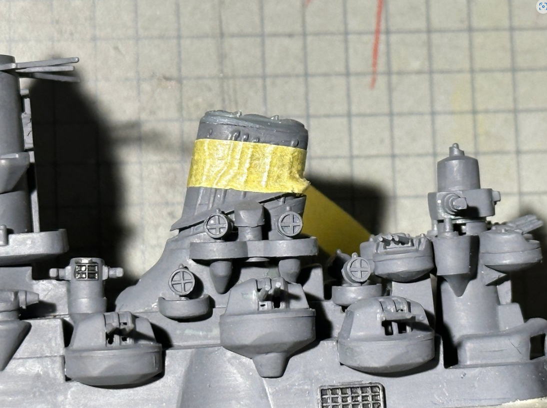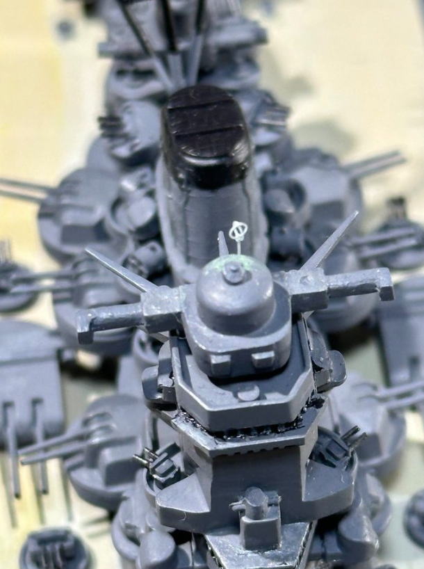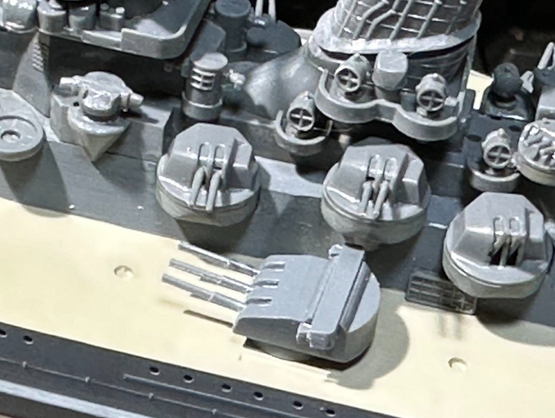 高角砲などの口径の小さい砲身は、方向をピンバイスで開けるのではなく塗装で表現。主砲射撃指揮所は白塗装説を採用して白く塗った。
