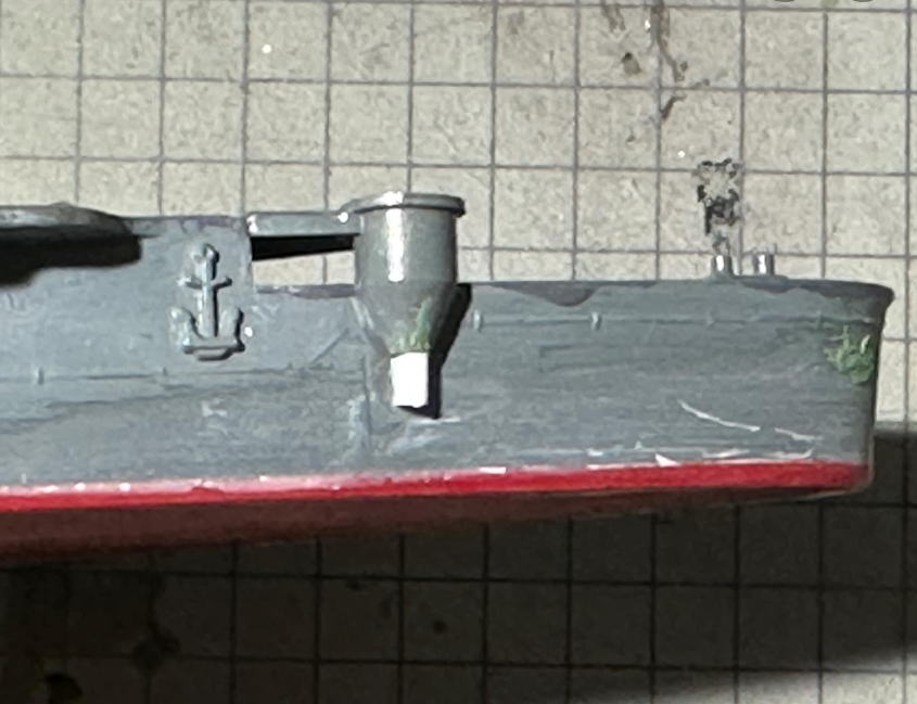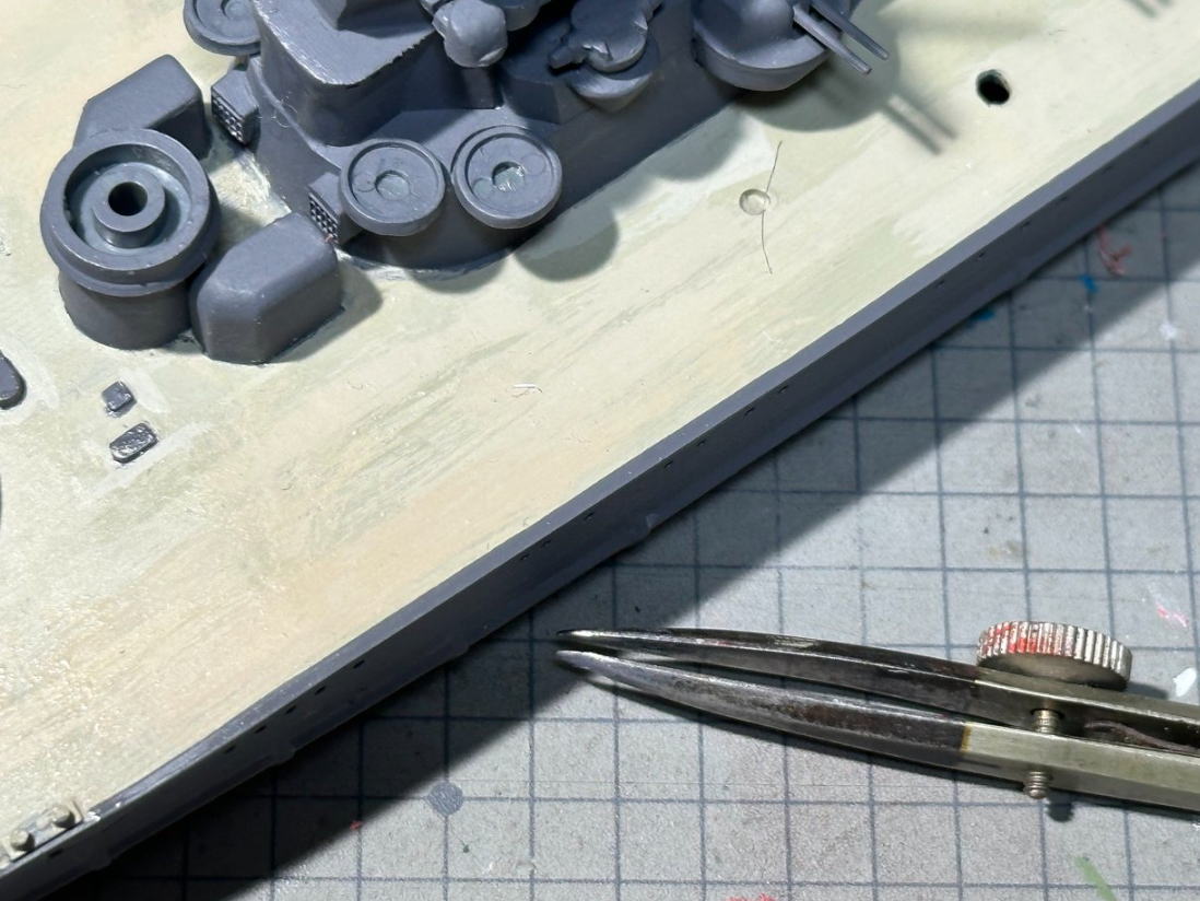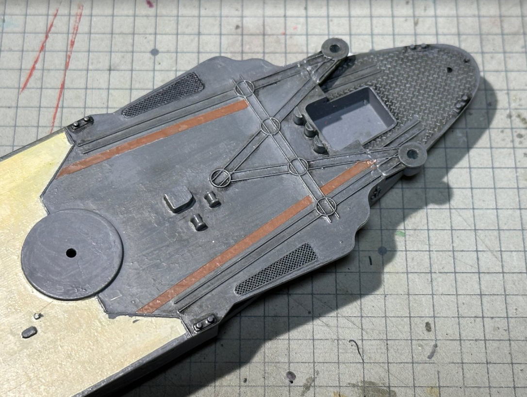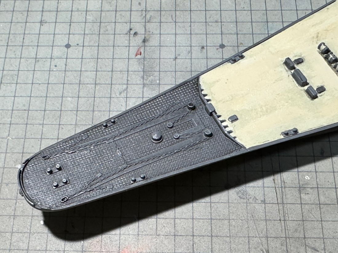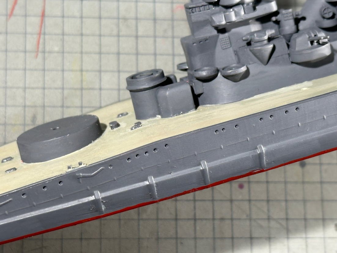 艦橋など上部構造物を再塗装した後に、船体と船底のカーブが合わず、且つ隙間があったのを溶きパテを使用して修正。整形中に左カタパルトの支柱先端が破損し、プラ棒を接着して整形という手間がかかった。