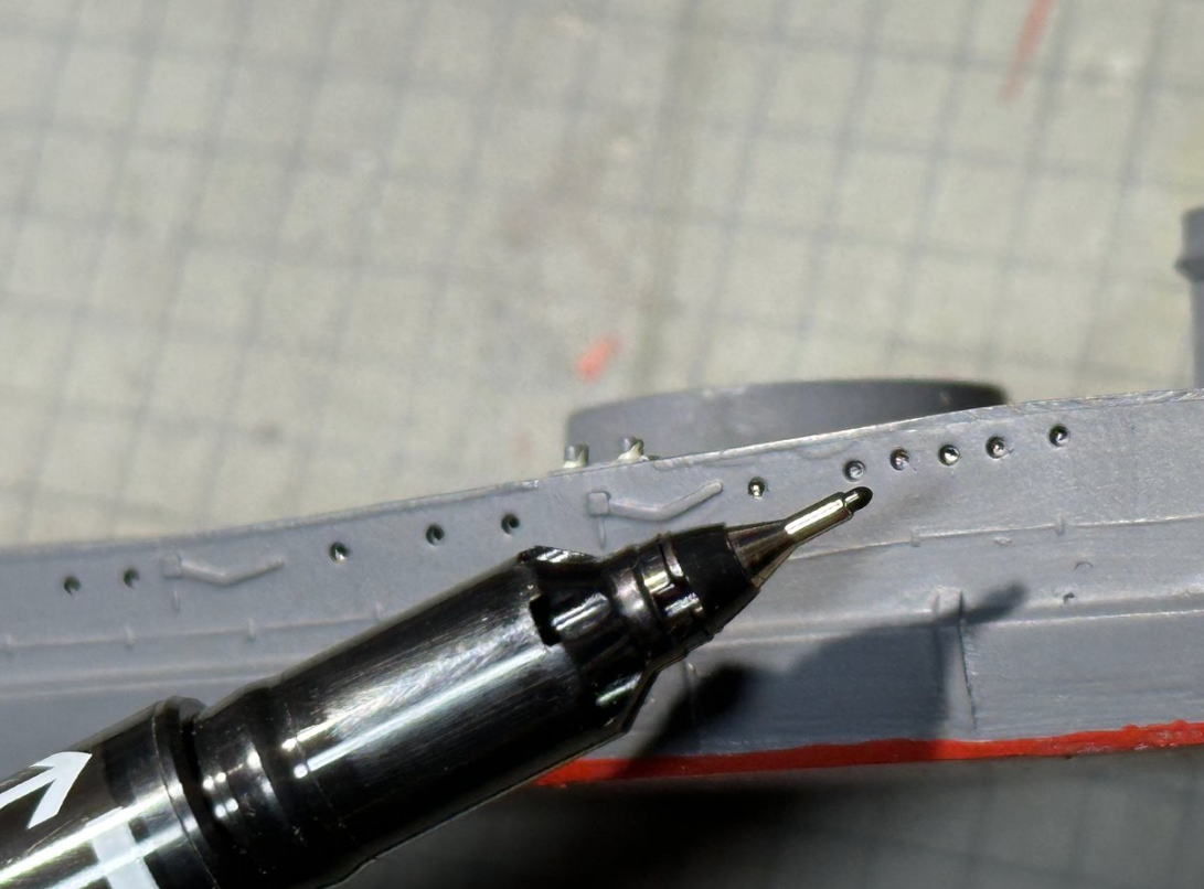 次に舷窓の塗装をするのであるが、この大きさだと塗料を流し込まずに、ゼブラのマッキーケア極細<油性>の極細ペン先を押し当てて再現。つやもあって窓の表現にはいい。
