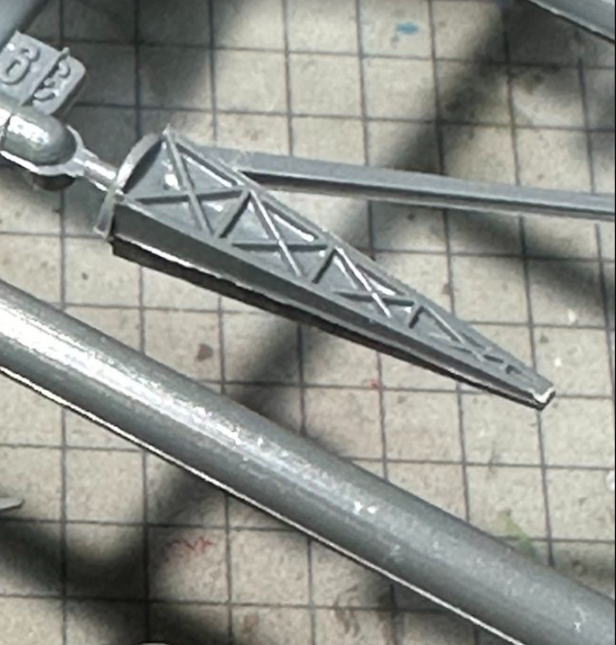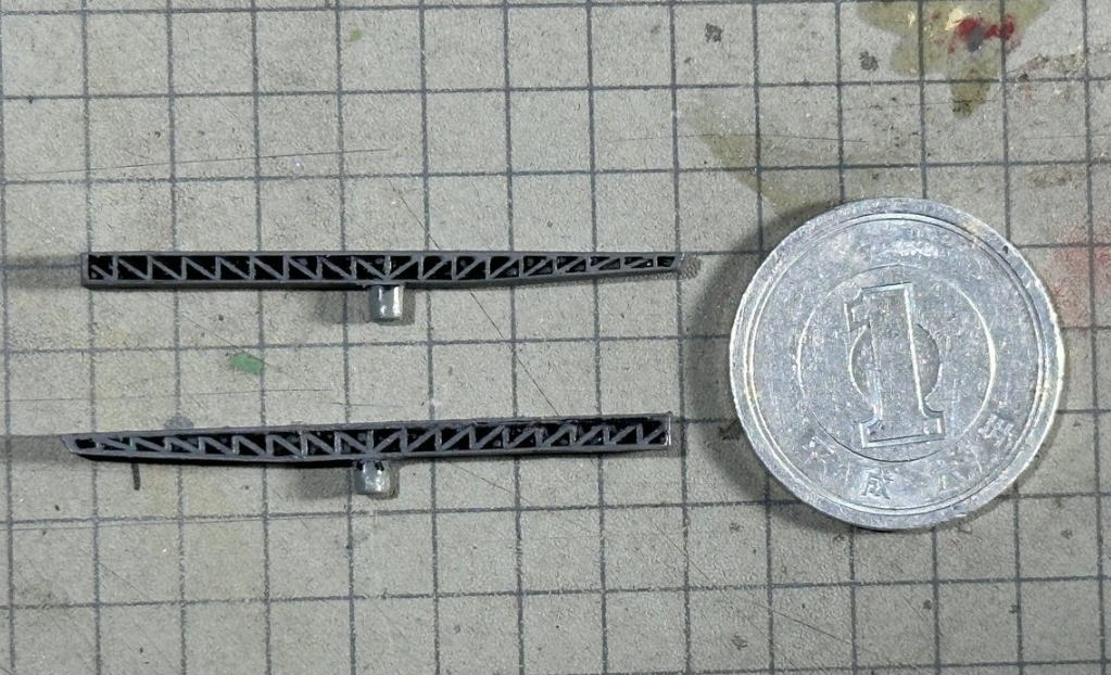 今回はエッチングは使わないことにして、クレーンもキットのパーツを使用。前後のモールドが無いのでカラスぐちと筆で塗装しトラスを表現した。